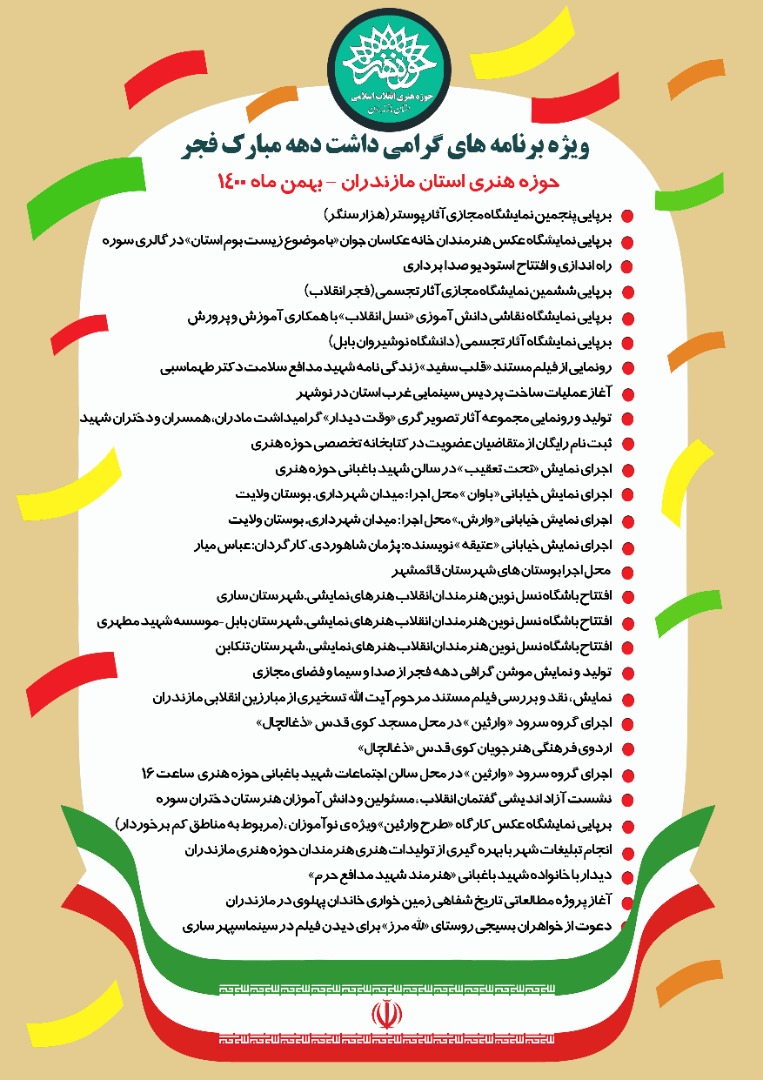 رییس حوزه هنری مازندران ضمن اشاره به مسئولیت کمیته هنری دهه فجر استان، درباره رویداد های مربوط به این ایام گفت: حوزه هنری نهادی انقلابی است و باید در ایام پیروزی انقلاب اسلامی بشکل ویژه عمل کند.