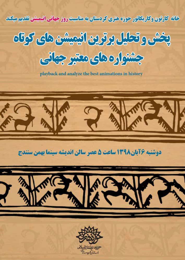 وی افزود : با توجه به اهمیت هنر انیمیشن و به منظور بررسی آثار برتر جشنواره های معتبر جهانی در این زمینه و تحلیل و بررسی شیوه های نوین تولید اثر، خانه کارتون و کاریکاتور حوزه هنری روز دوشنبه ۶ آبان ماه در قالب کارگاهی آموزشی تعدادی از برترین آثار انیمیشن جهان را در سالن اندیشه پردیس سینمایی بهمن سنندج پخش و توسط کارشناسان مربوطه مورد تجزیه و تحلیل قرار گرفت.
